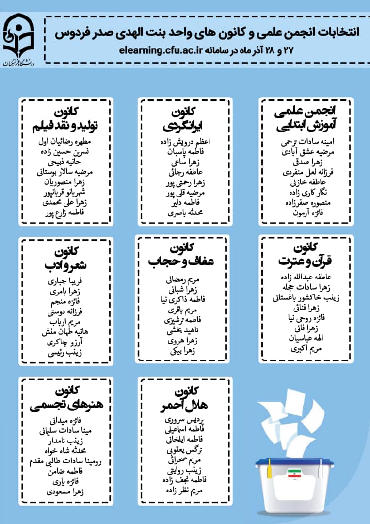 اطلاعیه برگزاری انتخابات کانون ها و انجمن علمی دانشگاه فرهنگیان واحد بنت الهدی صدر فردوس
