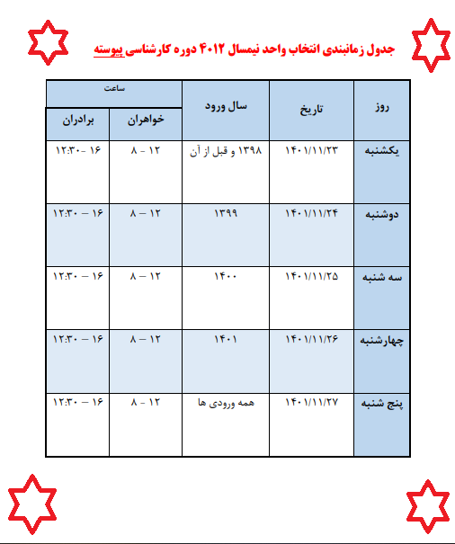 برنامه زمانبندی انتخاب واحد نیمسال دوم 1401 حضورتان اعلام می گردد لطفا بر اساس ورودی خود و در تاریخ وز مان اعلام شده وارد سامانه شوید و بر اساس دروسی که برایتان مشخص و اعلام شده انتخاب واحد کنید .