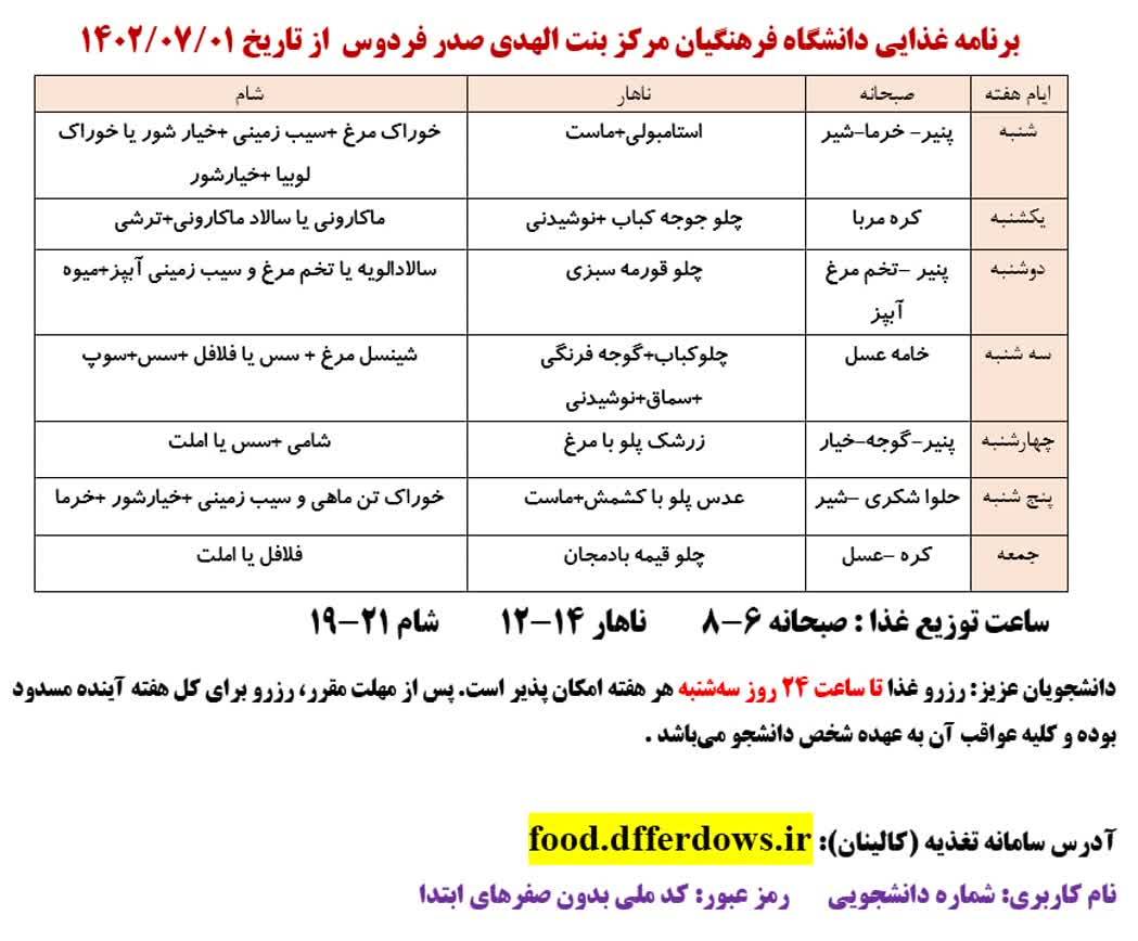 سامانه تغذیه دانشگاه فرهنگیان واحد بنت الهدی صدر فردوس
