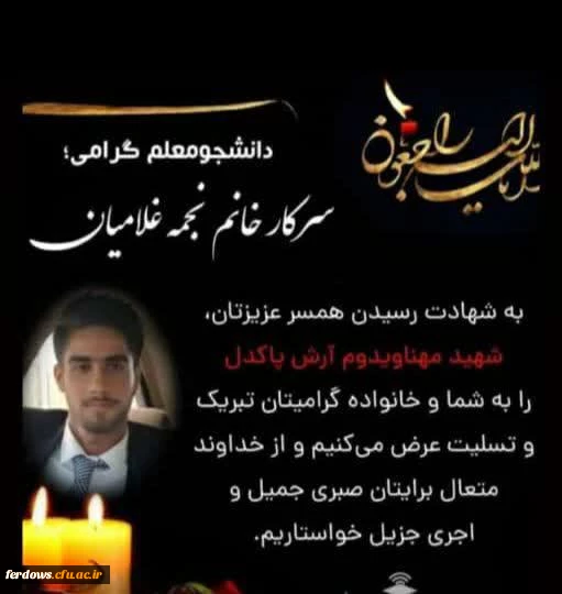 تسلیت به شهادت رسیدن همسر دانشجو معلم عزیزمان سرکار خانم نجمه غلامیان در حادثه ناوچه کنارک 2