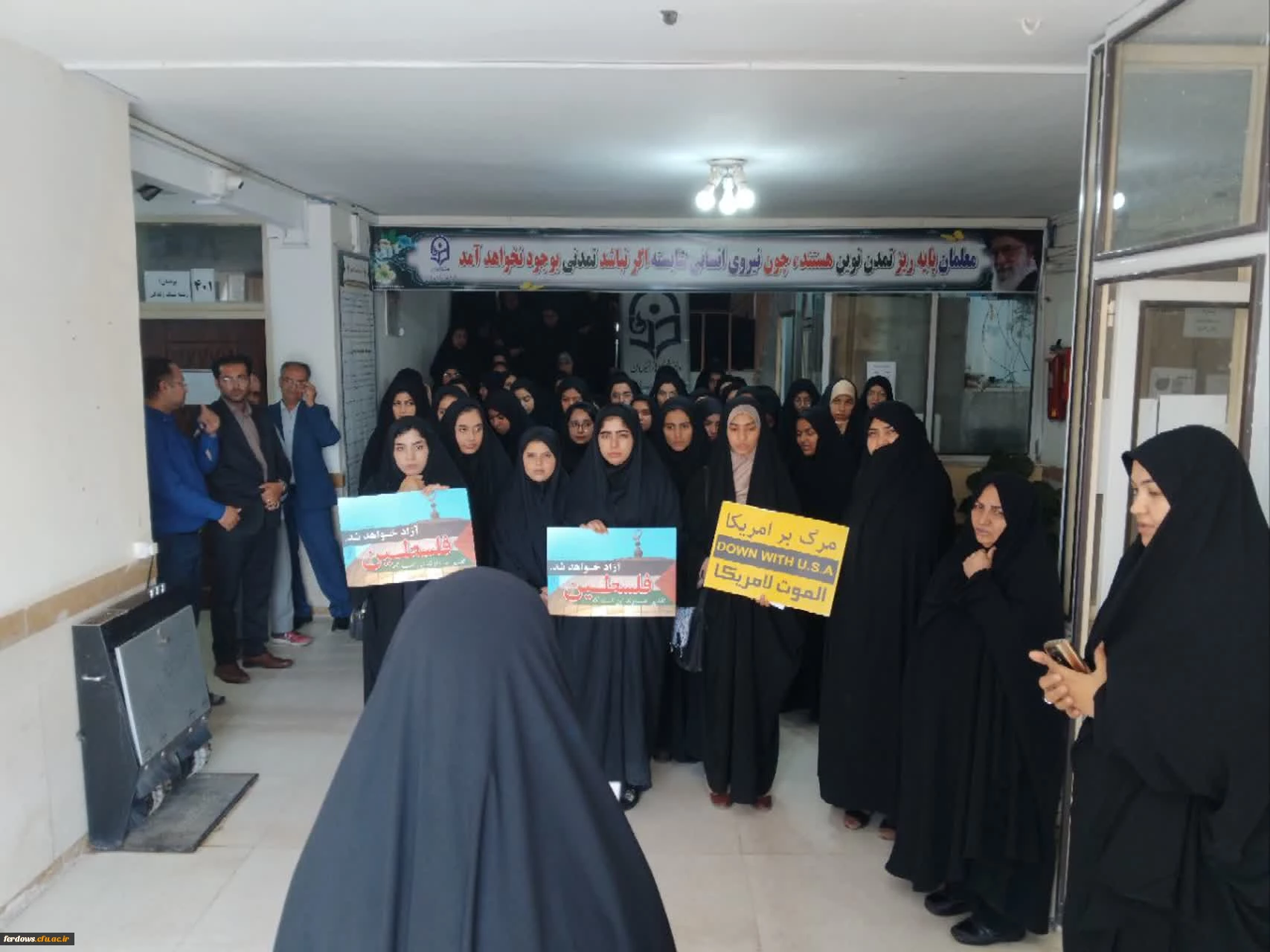 تجمع حمایتی اساتید، کارکنان و دانشجویان دانشگاه فرهنگیان فردوس در محکومیت جنایات رژیم صهیونیستی و همبستگی با مردم مظلوم غزه و فلسطین، امروز در مقابل ساختمان آموزشی-اداری دکتر مدبر عزیزی برگزار شد. 4